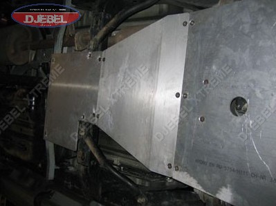 blindage de grande dimension protégeant intégralement la boite de vitesses et de transfert