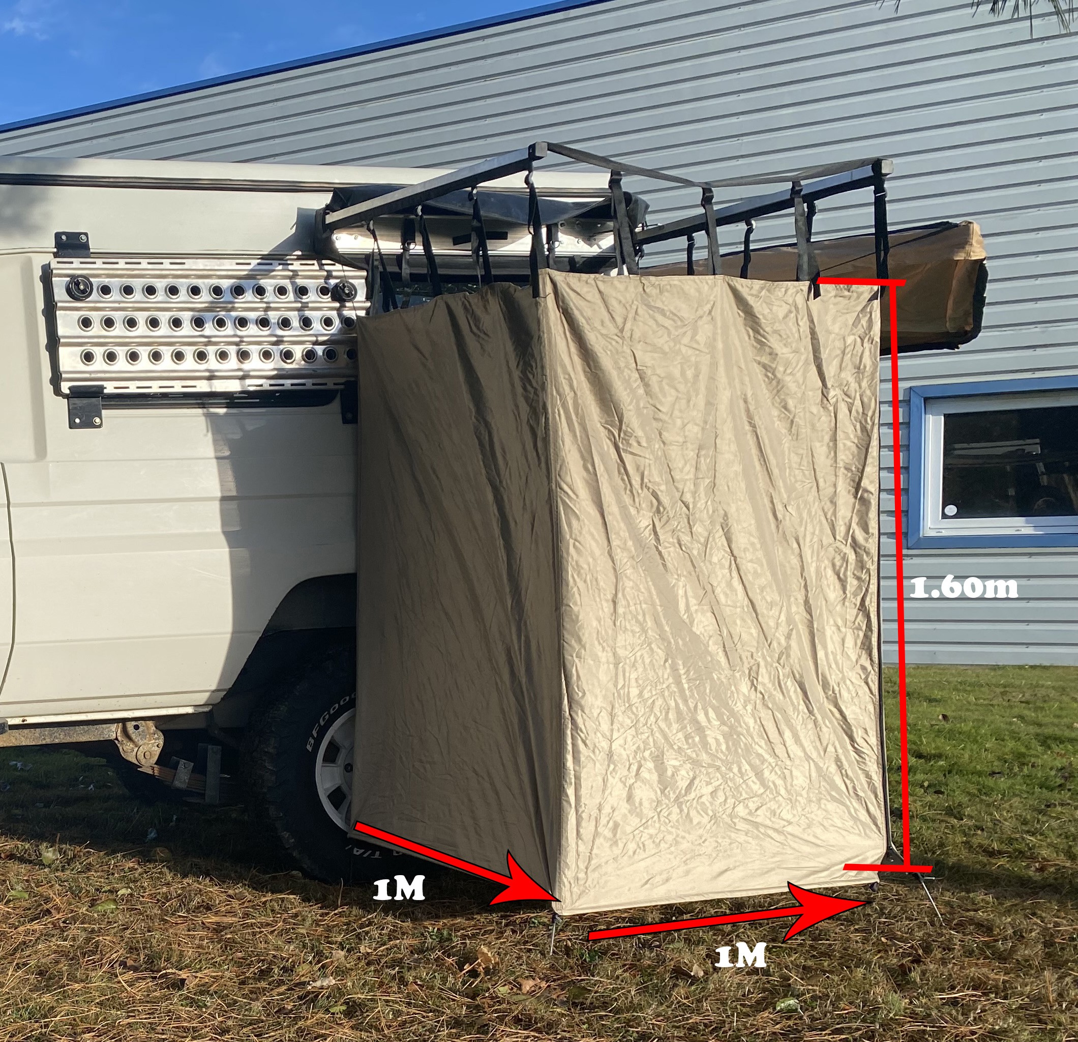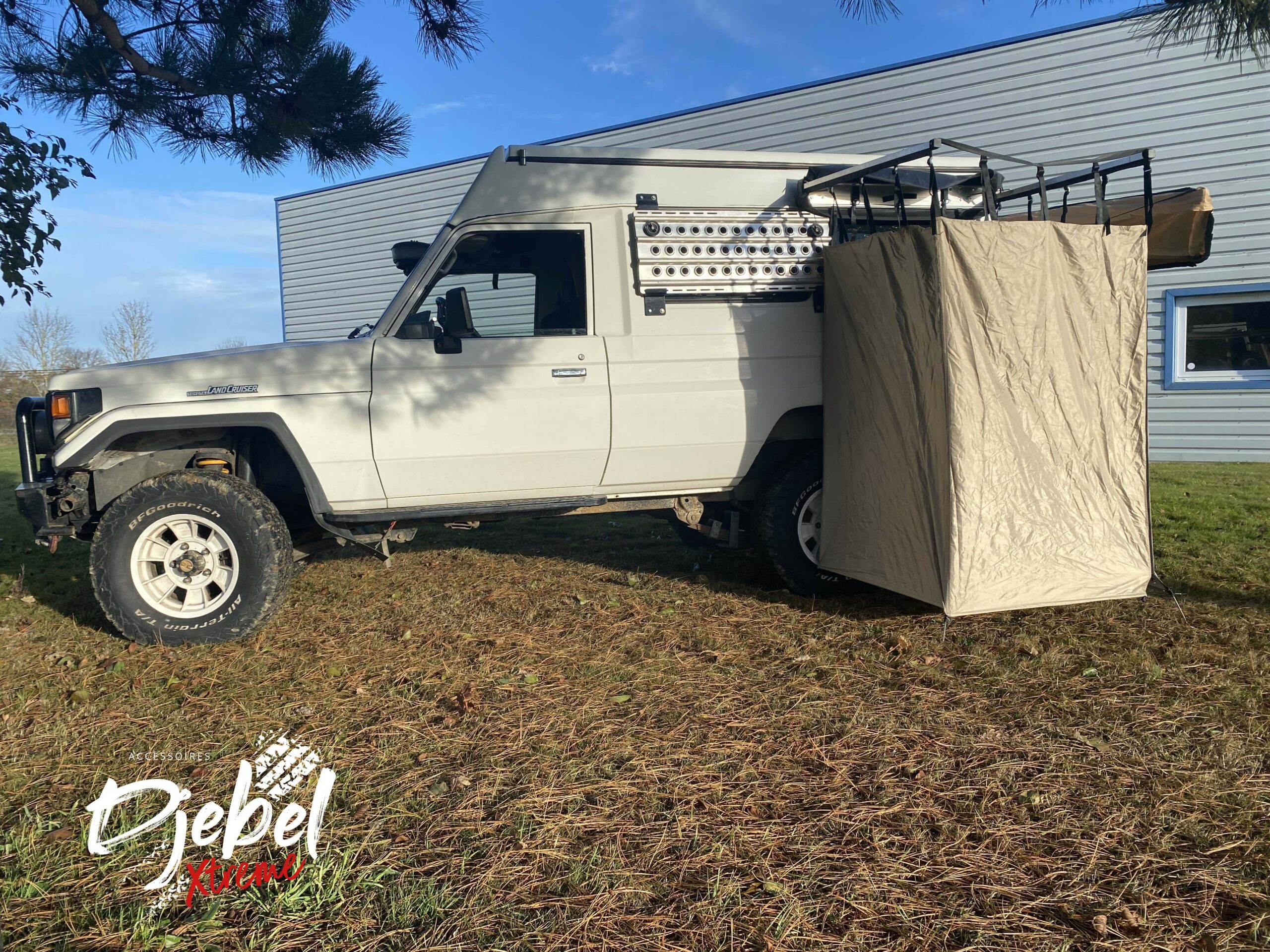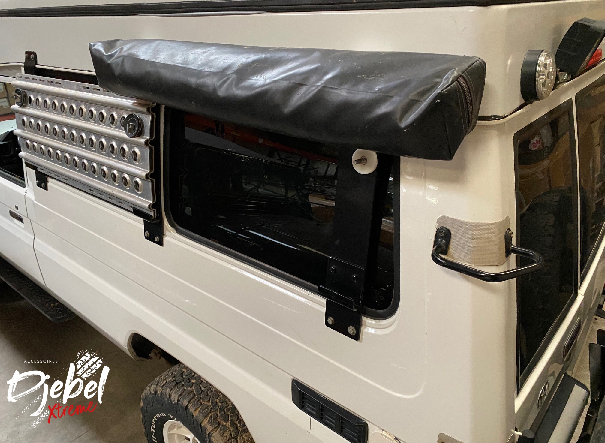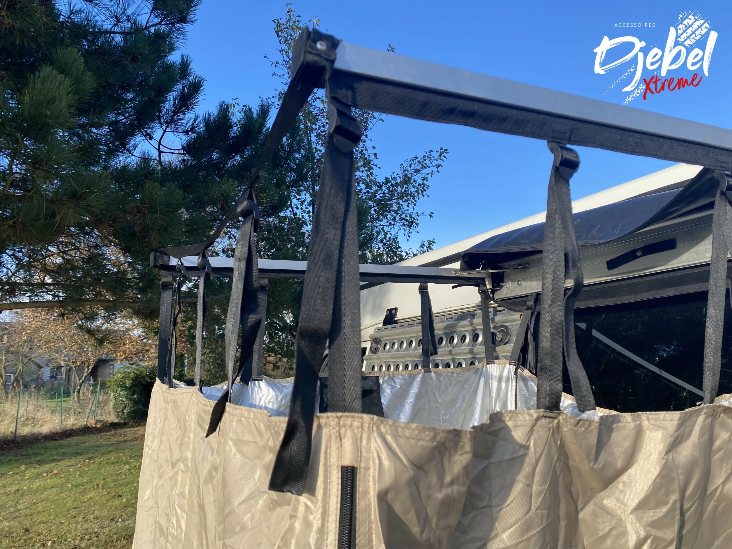Fixez votre cabine de douche DJEBELXtreme sur votre véhicule comme un auvent à l’aide des équerres de fixation.